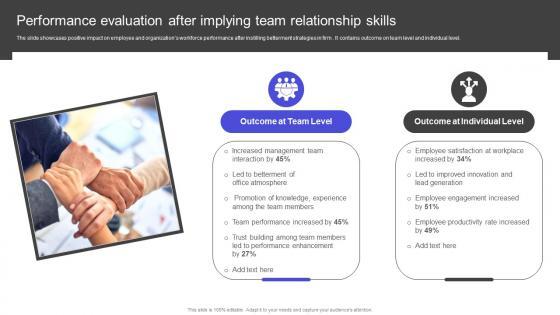 The slide showcases positive impact on employee and organizations workforce performance after instilling betterment strategies in firm . It contains outcome on team level and individual level. Here you can discover an assortment of the finest PowerPoint and Google Slides templates. With these templates, you can create presentations for a variety of purposes while simultaneously providing your audience with an eye-catching visual experience. Download Strategies To Build Meaningful Performance Evaluation After Implying Team Relationship Sample PDF to deliver an impeccable presentation. These templates will make your job of preparing presentations much quicker, yet still, maintain a high level of quality. Slidegeeks has experienced researchers who prepare these templates and write high-quality content for you. Later on, you can personalize the content by editing the Strategies To Build Meaningful Performance Evaluation After Implying Team Relationship Sample PDF The slide showcases positive impact on employee and organizations workforce performance after instilling betterment strategies in firm . It contains outcome on team level and individual level.