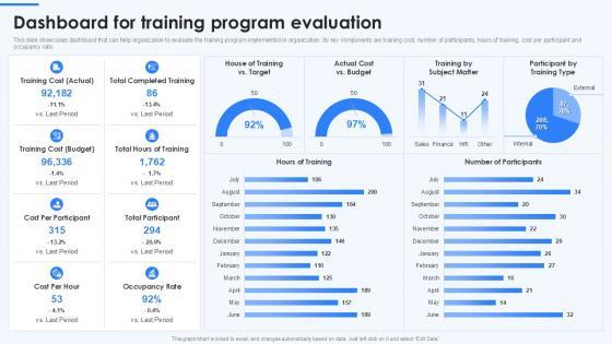 The Dashboard For Training Program Evaluation On Job Employee Training Program For Skills is a compilation of the most recent design trends as a series of slides. It is suitable for any subject or industry presentation, containing attractive visuals and photo spots for businesses to clearly express their messages. This template contains a variety of slides for the user to input data, such as structures to contrast two elements, bullet points, and slides for written information. Slidegeeks is prepared to create an impression. Our Dashboard for Training Program Evaluation on Job Employee Training Program for Skills shall offer a graphical representation providing insights to measure the effectiveness of an organizations training initiatives. This particular slide captures such important performance metrics such as the cost associated with training, number of participants, total hours undertaken in the training program, per participant cost, and occupation rate that help evaluate the entire program conducted.