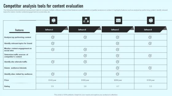 The following slide presents an assessment matrix to compare multiple software based on their features used to perform competitor analysis on content. It highlights features such as analyze top performing content, identify relevant topics for brand, monitor content engagement on social sites, etc. There are so many reasons you need a Steps To Conduct Competitor Analysis Competitor Analysis Tools For Content Evaluation Microsoft PDF. The first reason is you can not spend time making everything from scratch, Thus, Slidegeeks has made presentation templates for you too. You can easily download these templates from our website easily.