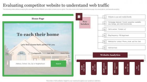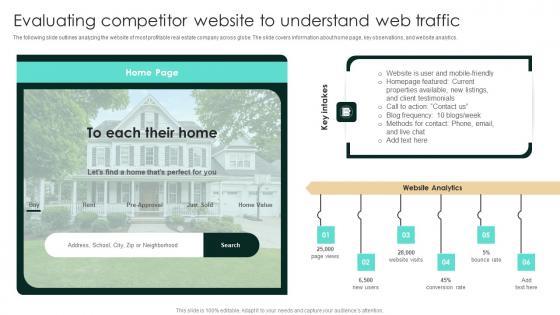 The following slide outlines analyzing the website of most profitable real estate company across globe. The slide covers information about home page, key observations, and website analytics. Present like a pro with Evaluating Competitor Website To Understand Web Traffic Icons PDF Create beautiful presentations together with your team, using our easy-to-use presentation slides. Share your ideas in real-time and make changes on the fly by downloading our templates. So whether you are in the office, on the go, or in a remote location, you can stay in sync with your team and present your ideas with confidence. With Slidegeeks presentation got a whole lot easier. Grab these presentations today.