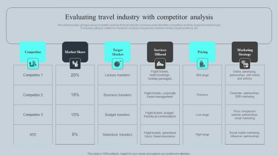 This slide provides glimpse about competitor analysis that can help the business understand the competition and their acquired market share. It includes category, platforms, freepaid, company background, revenue models, target audience, etc. Find highly impressive Evaluating Travel Industry With Competitor Tours And Travel Business Advertising Infographics Pdf on Slidegeeks to deliver a meaningful presentation. You can save an ample amount of time using these presentation templates. No need to worry to prepare everything from scratch because Slidegeeks experts have already done a huge research and work for you. You need to download Evaluating Travel Industry With Competitor Tours And Travel Business Advertising Infographics Pdf for your upcoming presentation. All the presentation templates are 100 percent editable and you can change the color and personalize the content accordingly. Download now. This slide provides glimpse about competitor analysis that can help the business understand the competition and their acquired market share. It includes category, platforms, freepaid, company background, revenue models, target audience, etc.