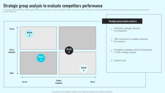 The following slide showcases strategic group analysis used as tool to conduct competitor analysis and compare various attributes of competing businesses. It showcases components such as brand reputation and product categories. Coming up with a presentation necessitates that the majority of the effort goes into the content and the message you intend to convey. The visuals of a PowerPoint presentation can only be effective if it supplements and supports the story that is being told. Keeping this in mind our experts created Strategic Group Analysis To Evaluate Competitors Performance Comprehensive Guide Background Pdf to reduce the time that goes into designing the presentation. This way, you can concentrate on the message while our designers take care of providing you with the right template for the situation. The following slide showcases strategic group analysis used as tool to conduct competitor analysis and compare various attributes of competing businesses. It showcases components such as brand reputation and product categories.