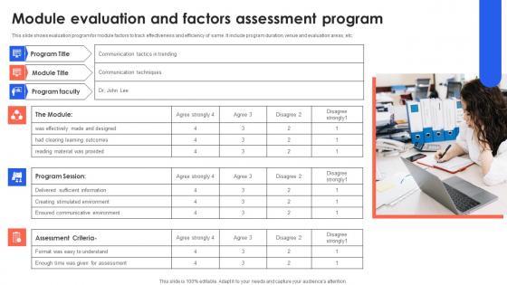 This slide shows evaluation program for module factors to track effectiveness and efficiency of same. It include program duration, venue and evaluation areas, etc.Pitch your topic with ease and precision using this Module Evaluation And Factors Assessment Program Mockup Pdf This layout presents information on Creating Stimulated Environment, Communicative Environment It is also available for immediate download and adjustment. So, changes can be made in the color, design, graphics or any other component to create a unique layout. This slide shows evaluation program for module factors to track effectiveness and efficiency of same. It include program duration, venue and evaluation areas, etc.