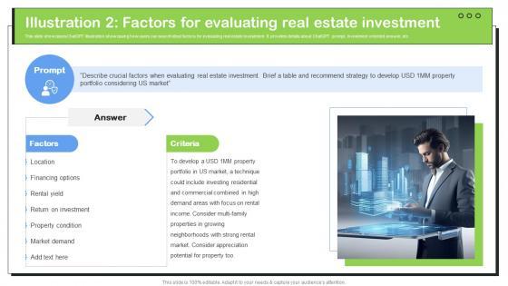 This slide showcases ChatGPT illustration showcasing how users can search ideal factors for evaluating real estate investment. It provides details about ChatGPT prompt, investment oriented answer, etc. Retrieve professionally designed Transforming Real Estate Illustration 2 Factors For Evaluating Real Estate ChatGPT SS V to effectively convey your message and captivate your listeners. Save time by selecting pre-made slideshows that are appropriate for various topics, from business to educational purposes. These themes come in many different styles, from creative to corporate, and all of them are easily adjustable and can be edited quickly. Access them as PowerPoint templates or as Google Slides themes. You do not have to go on a hunt for the perfect presentation because Slidegeeks got you covered from everywhere. This slide showcases ChatGPT illustration showcasing how users can search ideal factors for evaluating real estate investment. It provides details about ChatGPT prompt, investment oriented answer, etc.