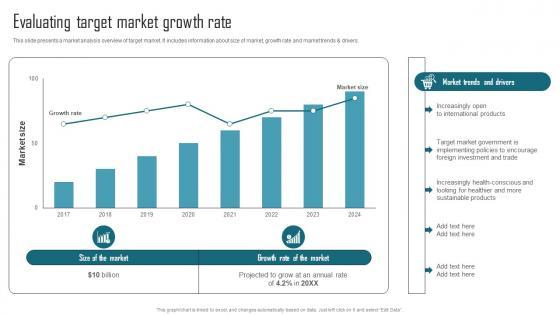 This slide showcases graph that can help organization to evaluate growth rate of target market. It can help company to identify potential and suitability of target market for expanding operations globally. This modern and well-arranged International Business Extension Evaluating Growth Rate Of Target Market Topics PDF provides lots of creative possibilities. It is very simple to customize and edit with the Powerpoint Software. Just drag and drop your pictures into the shapes. All facets of this template can be edited with Powerpoint, no extra software is necessary. Add your own material, put your images in the places assigned for them, adjust the colors, and then you can show your slides to the world, with an animated slide included.