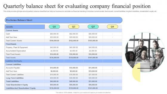 This slide provides glimpse about quarterly balance sheet that can help our business to calculate our financial standing. It includes current assets, fixed assets, current liabilities, long term liabilities, shareholders equity, etc. Here you can discover an assortment of the finest PowerPoint and Google Slides templates. With these templates, you can create presentations for a variety of purposes while simultaneously providing your audience with an eye-catching visual experience. Download Strategic Financial Planning And Administration Quarterly Balance Sheet Evaluating Graphics PDF to deliver an impeccable presentation. These templates will make your job of preparing presentations much quicker, yet still, maintain a high level of quality. Slidegeeks has experienced researchers who prepare these templates and write high-quality content for you. Later on, you can personalize the content by editing the Strategic Financial Planning And Administration Quarterly Balance Sheet Evaluating Graphics PDF. This slide provides glimpse about quarterly balance sheet that can help our business to calculate our financial standing. It includes current assets, fixed assets, current liabilities, long term liabilities, shareholders equity, etc.