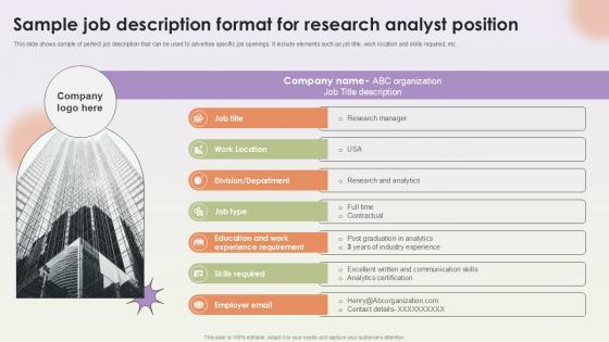 This slide shows sample of perfect job description that can be used to advertise specific job openings. It include elements such as job title, work location and skills required, etc. Create an editable Sample Job Description Format For Research Workforce Procurement And Aptitude Evaluation Ppt Example that communicates your idea and engages your audience. Whether you are presenting a business or an educational presentation, pre-designed presentation templates help save time. Sample Job Description Format For Research Workforce Procurement And Aptitude Evaluation Ppt Example is highly customizable and very easy to edit, covering many different styles from creative to business presentations. Slidegeeks has creative team members who have crafted amazing templates. So, go and get them without any delay. This slide shows sample of perfect job description that can be used to advertise specific job openings. It include elements such as job title, work location and skills required, etc.