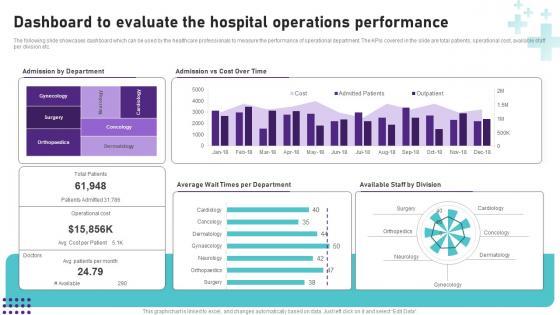 Present like a pro with Dashboard To Evaluate The Hospital Operational Areas Healthcare Professional PDF Create beautiful presentations together with your team, using our easy-to-use presentation slides. Share your ideas in real-time and make changes on the fly by downloading our templates. So whether you are in the office, on the go, or in a remote location, you can stay in sync with your team and present your ideas with confidence. With Slidegeeks presentation got a whole lot easier. Grab these presentations today. The following slide showcases dashboard which can be used by the healthcare professionals to measure the performance of operational department. The KPIs covered in the slide are total patients, operational cost, available staff per division etc.
