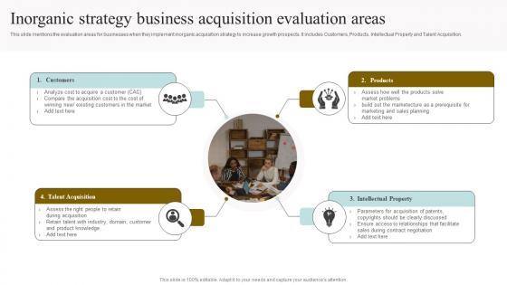 This slide mentions the evaluation areas for businesses when they implement inorganic acquisition strategy to increase growth prospects. It includes Customers, Products, Intellectual Property and Talent Acquisition. Showcasing this set of slides titled Inorganic Strategy Business Acquisition Evaluation Areas Slides Pdf. The topics addressed in these templates are Customers, Talent Acquisition, Intellectual Property. All the content presented in this PPT design is completely editable. Download it and make adjustments in color, background, font etc. as per your unique business setting. This slide mentions the evaluation areas for businesses when they implement inorganic acquisition strategy to increase growth prospects. It includes Customers, Products, Intellectual Property and Talent Acquisition.