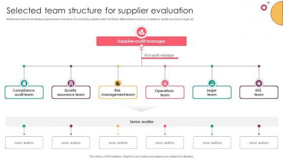 Mentioned slide demonstrates organized team structure of conducting supplier audit. It includes different team such as compliance, quality assurance, legal, etc. Welcome to our selection of the Strategic Supplier Evaluation Selected Team Structure For Supplier Evaluation. These are designed to help you showcase your creativity and bring your sphere to life. Planning and Innovation are essential for any business that is just starting out. This collection contains the designs that you need for your everyday presentations. All of our PowerPoints are 100Percent editable, so you can customize them to suit your needs. This multi-purpose template can be used in various situations. Grab these presentation templates today. Mentioned slide demonstrates organized team structure of conducting supplier audit. It includes different team such as compliance, quality assurance, legal, etc.