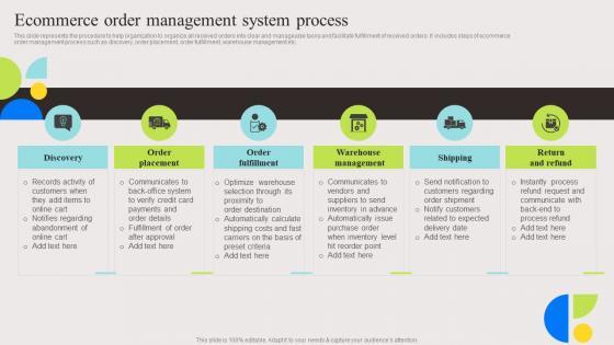 This slide represents the procedure to help organization to organize all received orders into clear and manageable tasks and facilitate fulfillment of received orders. It includes steps of ecommerce order management process such as discovery, order placement, order fulfillment, warehouse management etc. Whether you have daily or monthly meetings, a brilliant presentation is necessary. Ecommerce Order Management System Evaluation And Deployment Of Enhanced Icons Pdf can be your best option for delivering a presentation. Represent everything in detail using Ecommerce Order Management System Evaluation And Deployment Of Enhanced Icons Pdf and make yourself stand out in meetings. The template is versatile and follows a structure that will cater to your requirements. All the templates prepared by Slidegeeks are easy to download and edit. Our research experts have taken care of the corporate themes as well. So, give it a try and see the results. This slide represents the procedure to help organization to organize all received orders into clear and manageable tasks and facilitate fulfillment of received orders. It includes steps of ecommerce order management process such as discovery, order placement, order fulfillment, warehouse management etc.