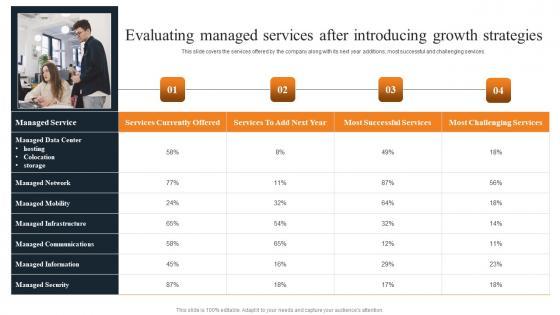 This slide covers the services offered by the company along with its next year additions, most successful and challenging services. The best PPT templates are a great way to save time, energy, and resources. Slidegeeks have 100 percent editable powerpoint slides making them incredibly versatile. With these quality presentation templates, you can create a captivating and memorable presentation by combining visually appealing slides and effectively communicating your message. Download Evaluating Managed Services After Layered Pricing Strategy For Managed Services Icons Pdf from Slidegeeks and deliver a wonderful presentation. This slide covers the services offered by the company along with its next year additions, most successful and challenging services.