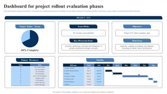 This slide depicts analysis of project xyz rollout plan for a particular time period to identify risk and status of project. It includes objective, main focus, issues, status, resources and timeline of project.Showcasing this set of slides titled Dashboard For Project Rollout Evaluation Phases Sample Pdf The topics addressed in these templates are Improving Usability, Discussion Items, Rollout Evauation All the content presented in this PPT design is completely editable. Download it and make adjustments in color, background, font etc. as per your unique business setting. This slide depicts analysis of project xyz rollout plan for a particular time period to identify risk and status of project. It includes objective, main focus, issues, status, resources and timeline of project.