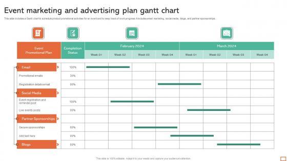 This slide includes a Gantt chart to schedule product promotional activities for an event and to keep track of work progress. It includes email marketing, social media, blogs, and partner sponsorships. Pitch your topic with ease and precision using this Event Marketing And Advertising Plan Gantt Chart Professional Pdf. This layout presents information on Social Media, Partner Sponsorships. It is also available for immediate download and adjustment. So, changes can be made in the color, design, graphics or any other component to create a unique layout. This slide includes a Gantt chart to schedule product promotional activities for an event and to keep track of work progress. It includes email marketing, social media, blogs, and partner sponsorships.