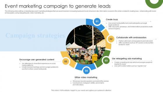 The following slide outlines comprehensive event marketing strategies that can assist brands in increasing leads and boost conversion rate. Information covered in this slide is related to creating buzz, collaborating with brand ambassadors, using retargeting ads, video marketing, etc. Do you have an important presentation coming up Are you looking for something that will make your presentation stand out from the rest Look no further than Event Marketing Campaign To Generate Leads Information PDF. With our professional designs, you can trust that your presentation will pop and make delivering it a smooth process. And with Slidegeeks, you can trust that your presentation will be unique and memorable. So why wait Grab Event Marketing Campaign To Generate Leads Information PDF today and make your presentation stand out from the rest