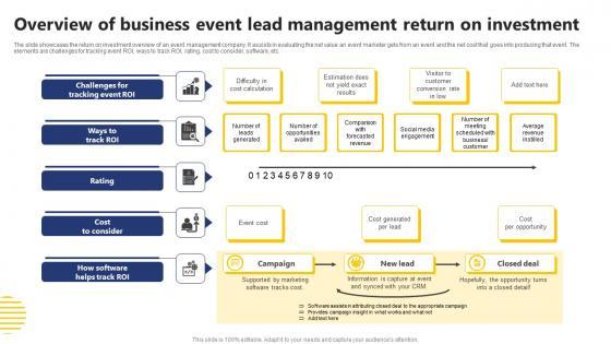 The slide showcases the return on investment overview of an event management company. It assists in evaluating the net value an event marketer gets from an event and the net cost that goes into producing that event. The elements are challenges for tracking event ROI, ways to track ROI, rating, cost to consider, software, etc. Showcasing this set of slides titled Overview Of Business Event Lead Management Return On Investment Summary Pdf The topics addressed in these templates are Challenges For Tracking, Cost To Consider, Software Helps Track All the content presented in this PPT design is completely editable. Download it and make adjustments in color, background, font etc. as per your unique business setting. The slide showcases the return on investment overview of an event management company. It assists in evaluating the net value an event marketer gets from an event and the net cost that goes into producing that event. The elements are challenges for tracking event ROI, ways to track ROI, rating, cost to consider, software, etc.