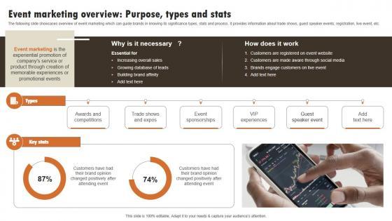 The following slide showcases overview of event marketing which can guide brands in knowing its significance types, stats and process. It provides information about trade shows, guest speaker events, registration, live event, etc. Make sure to capture your audiences attention in your business displays with our gratis customizable Event Marketing Overview Purpose Types Experiential Marketing Technique Infographics PDF. These are great for business strategies, office conferences, capital raising or task suggestions. If you desire to acquire more customers for your tech business and ensure they stay satisfied, create your own sales presentation with these plain slides. The following slide showcases overview of event marketing which can guide brands in knowing its significance types, stats and process. It provides information about trade shows, guest speaker events, registration, live event, etc.