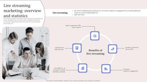 This slide provides an overview of live-streaming marketing and its key benefits to the company. Major benefits covered are encourage engagement, increase conversion rate, generate more leads, etc. Coming up with a presentation necessitates that the majority of the effort goes into the content and the message you intend to convey. The visuals of a PowerPoint presentation can only be effective if it supplements and supports the story that is being told. Keeping this in mind our experts created Live Streaming Marketing Overview And Statistics Virtual Event Promotion To Capture Clipart Pdf to reduce the time that goes into designing the presentation. This way, you can concentrate on the message while our designers take care of providing you with the right template for the situation. This slide provides an overview of live-streaming marketing and its key benefits to the company. Major benefits covered are encourage engagement, increase conversion rate, generate more leads, etc.