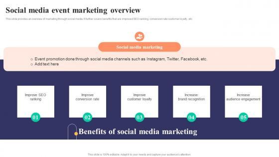 This slide provides an overview of marketing through social media. It further covers benefits that are improved SEO ranking, conversion rate customer loyalty, etc. Slidegeeks is one of the best resources for PowerPoint templates. You can download easily and regulate Social Media Event Marketing Overview Ideas PDF for your personal presentations from our wonderful collection. A few clicks is all it takes to discover and get the most relevant and appropriate templates. Use our Templates to add a unique zing and appeal to your presentation and meetings. All the slides are easy to edit and you can use them even for advertisement purposes.