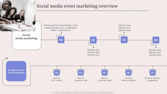 This slide provides an overview of marketing through social media. It further covers benefits that are improved SEO ranking, conversion rate customer loyalty, etc. The Social Media Event Marketing Overview Ppt Infographic Template Show PDF is a compilation of the most recent design trends as a series of slides. It is suitable for any subject or industry presentation, containing attractive visuals and photo spots for businesses to clearly express their messages. This template contains a variety of slides for the user to input data, such as structures to contrast two elements, bullet points, and slides for written information. Slidegeeks is prepared to create an impression.