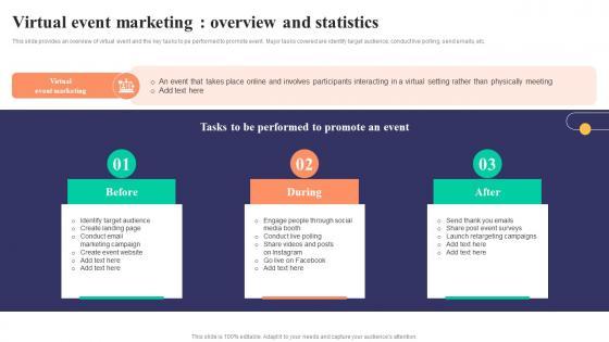 This slide provides an overview of virtual event and the key tasks to pe performed to promote event. Major tasks covered are identify target audience, conduct live polling, send emails, etc. Slidegeeks is here to make your presentations a breeze with Virtual Event Marketing Overview And Statistics Graphics PDF With our easy to use and customizable templates, you can focus on delivering your ideas rather than worrying about formatting. With a variety of designs to choose from, you are sure to find one that suits your needs. And with animations and unique photos, illustrations, and fonts, you can make your presentation pop. So whether you are giving a sales pitch or presenting to the board, make sure to check out Slidegeeks first.