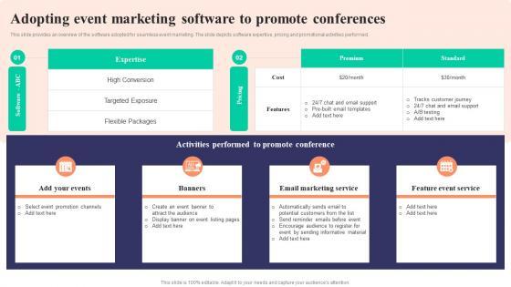 This slide provides an overview of the software adopted for seamless event marketing. The slide depicts software expertise, pricing and promotional activities performed. Are you searching for a Adopting Event Marketing Software To Promote Conferences Demonstration PDF that is uncluttered, straightforward, and original Its easy to edit, and you can change the colors to suit your personal or business branding. For a presentation that expresses how much effort you have put in, this template is ideal With all of its features, including tables, diagrams, statistics, and lists, its perfect for a business plan presentation. Make your ideas more appealing with these professional slides. Download Adopting Event Marketing Software To Promote Conferences Demonstration PDF from Slidegeeks today.