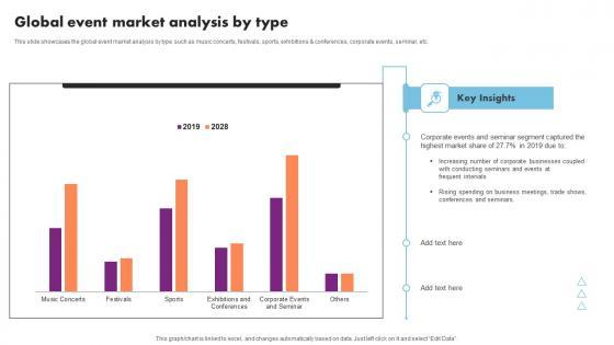 This slide showcases the global event market analysis by type such as music concerts, festivals, sports, exhibitions and conferences, corporate events, seminar, etc. Do you have an important presentation coming up Are you looking for something that will make your presentation stand out from the rest Look no further than Event Management Business Plan Go To Market Strategy Global Event Market Analysis Type Ideas Pdf. With our professional designs, you can trust that your presentation will pop and make delivering it a smooth process. And with Slidegeeks, you can trust that your presentation will be unique and memorable. So why wait Grab Event Management Business Plan Go To Market Strategy Global Event Market Analysis Type Ideas Pdf today and make your presentation stand out from the rest This slide showcases the global event market analysis by type such as music concerts, festivals, sports, exhibitions and conferences, corporate events, seminar, etc.