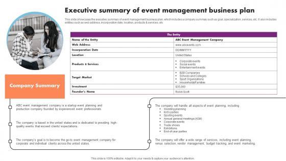 This slide showcases the executive summary of event management business plan, which includes a company summary such as goal, specialization, services, etc. It also includes entities such as web address, incorporation date, location, products and services, etc If you are looking for a format to display your unique thoughts, then the professionally designed Executive Summary Of Event Management Business Plan Information Pdf is the one for you. You can use it as a Google Slides template or a PowerPoint template. Incorporate impressive visuals, symbols, images, and other charts. Modify or reorganize the text boxes as you desire. Experiment with shade schemes and font pairings. Alter, share or cooperate with other people on your work. Download Executive Summary Of Event Management Business Plan Information Pdf and find out how to give a successful presentation. Present a perfect display to your team and make your presentation unforgettable. This slide showcases the executive summary of event management business plan, which includes a company summary such as goal, specialization, services, etc. It also includes entities such as web address, incorporation date, location, products and services, etc