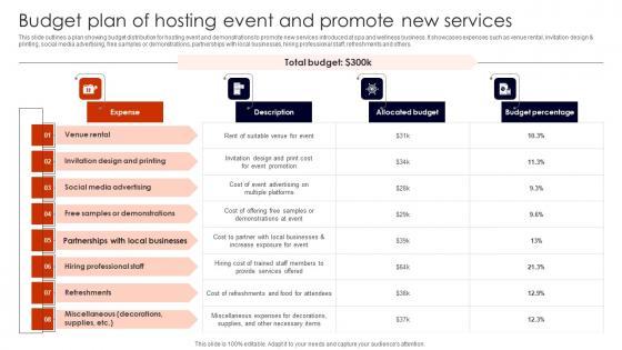 This slide outlines a plan showing budget distribution for hosting event and demonstrations to promote new services introduced at spa and wellness business. It showcases expenses such as venue rental, invitation design and printing, social media advertising, free samples or demonstrations, partnerships with local businesses, hiring professional staff, refreshments and others. Slidegeeks is one of the best resources for PowerPoint templates. You can download easily and regulate Budget Plan Of Hosting Event Building Spa Business Brand Presence Marketing Infographics Pdf for your personal presentations from our wonderful collection. A few clicks is all it takes to discover and get the most relevant and appropriate templates. Use our Templates to add a unique zing and appeal to your presentation and meetings. All the slides are easy to edit and you can use them even for advertisement purposes. This slide outlines a plan showing budget distribution for hosting event and demonstrations to promote new services introduced at spa and wellness business. It showcases expenses such as venue rental, invitation design and printing, social media advertising, free samples or demonstrations, partnerships with local businesses, hiring professional staff, refreshments and others.