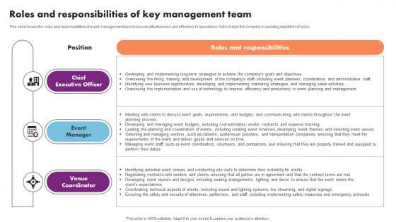 This slide covers the roles and responsibilities of event management team to ensure effectiveness and efficiency in operations. It also helps the company in avoiding repetition of tasks Create an editable Roles Responsibilities Key Management Event Management Business Plan Go To Market Strategy Mockup Pdf that communicates your idea and engages your audience. Whether you are presenting a business or an educational presentation, pre designed presentation templates help save time. Roles Responsibilities Key Management Event Management Business Plan Go To Market Strategy Mockup Pdf is highly customizable and very easy to edit, covering many different styles from creative to business presentations. Slidegeeks has creative team members who have crafted amazing templates. So, go and get them without any delay. This slide covers the roles and responsibilities of event management team to ensure effectiveness and efficiency in operations. It also helps the company in avoiding repetition of tasks