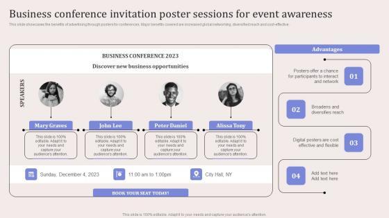 This slide showcases the benefits of advertising through posters for conferences. Major benefits covered are increased global networking, diversified reach and cost-effective. Welcome to our selection of the Networking Events Business Conference Invitation Poster Sessions For Event Awareness Sample PDF. These are designed to help you showcase your creativity and bring your sphere to life. Planning and Innovation are essential for any business that is just starting out. This collection contains the designs that you need for your everyday presentations. All of our PowerPoints are 100 percent editable, so you can customize them to suit your needs. This multi-purpose template can be used in various situations. Grab these presentation templates today