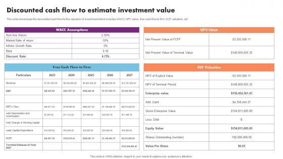 This slide showcases the discounted cash flow for the valuation of investment which includes WACC, NPV value, free cash flow to firm, DCF valuation, etc From laying roadmaps to briefing everything in detail, our templates are perfect for you. You can set the stage with your presentation slides. All you have to do is download these easy to edit and customizable templates. Discounted Cash Flow To Estimate Event Management Business Plan Go To Market Strategy Formats Pdf will help you deliver an outstanding performance that everyone would remember and praise you for. Do download this presentation today. This slide showcases the discounted cash flow for the valuation of investment which includes WACC, NPV value, free cash flow to firm, DCF valuation, etc