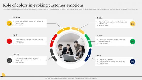 This slide showcases significance of colors in stimulating customer emotions. It provides details about black, red, orange, yellow, green, blue, formaility, power, energy love, passion, optimism, warmth, happiness, sustainability, etc.From laying roadmaps to briefing everything in detail, our templates are perfect for you. You can set the stage with your presentation slides. All you have to do is download these easy-to-edit and customizable templates. Role Of Colors In Evoking Customer Emotions Improving Customer Interaction Through Sample Pdf will help you deliver an outstanding performance that everyone would remember and praise you for. Do download this presentation today. This slide showcases significance of colors in stimulating customer emotions. It provides details about black, red, orange, yellow, green, blue, formaility, power, energy love, passion, optimism, warmth, happiness, sustainability, etc.