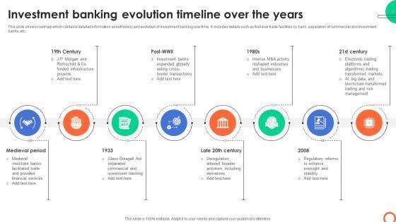 This slide shows roadmap which contains detailed information about history and evolution of investment banking over time. It includes details such as first ever trade facilities by bank, separation of commercial and investment banks, etc. Welcome to our selection of the Investment Banking Evolution Timeline Over Understanding Investment Banking Framework Fin SS V. These are designed to help you showcase your creativity and bring your sphere to life. Planning and Innovation are essential for any business that is just starting out. This collection contains the designs that you need for your everyday presentations. All of our PowerPoints are 100Percent editable, so you can customize them to suit your needs. This multi-purpose template can be used in various situations. Grab these presentation templates today. This slide shows roadmap which contains detailed information about history and evolution of investment banking over time. It includes details such as first ever trade facilities by bank, separation of commercial and investment banks, etc.