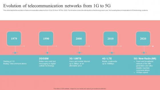 This slide depicts the evolution of telecommunication networks from 1G to 5G from 1979 to 2020. The timeline covers the introduction of technology each year, from analog telecommunication to 5G technology systems. Get a simple yet stunning designed Evolution Of Telecommunication Networks From Revolutionizing Mobile Networks Portrait PDF. It is the best one to establish the tone in your meetings. It is an excellent way to make your presentations highly effective. So, download this PPT today from Slidegeeks and see the positive impacts. Our easy-to-edit Evolution Of Telecommunication Networks From Revolutionizing Mobile Networks Portrait PDF can be your go-to option for all upcoming conferences and meetings. So, what are you waiting for Grab this template today. This slide depicts the evolution of telecommunication networks from 1G to 5G from 1979 to 2020. The timeline covers the introduction of technology each year, from analog telecommunication to 5G technology systems.