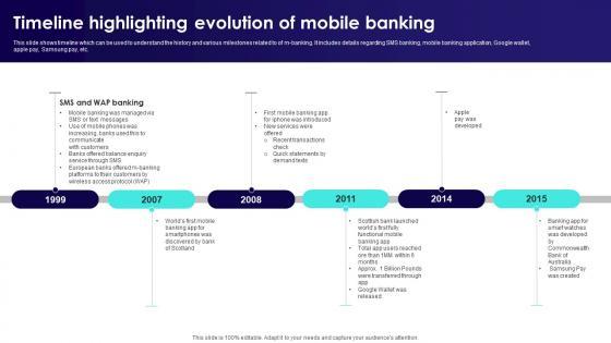 This slide shows timeline which can be used to understand the history and various milestones related to of m-banking. It includes details regarding SMS banking, mobile banking application, Google wallet, apple pay, Samsung pay, etc. The best PPT templates are a great way to save time, energy, and resources. Slidegeeks have 100 percent editable powerpoint slides making them incredibly versatile. With these quality presentation templates, you can create a captivating and memorable presentation by combining visually appealing slides and effectively communicating your message. Download Wireless Banking To Improve Timeline Highlighting Evolution Of Mobile Banking Fin SS V from Slidegeeks and deliver a wonderful presentation. This slide shows timeline which can be used to understand the history and various milestones related to of m-banking. It includes details regarding SMS banking, mobile banking application, Google wallet, apple pay, Samsung pay, etc.