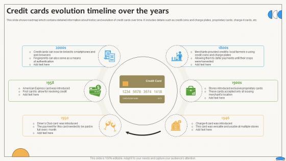 This slide shows roadmap which contains detailed information about history and evolution of credit cards over time. It includes details such as credit coins and charge plates, proprietary cards, charge-it cards, etc. Make sure to capture your audiences attention in your business displays with our gratis customizable Credit Cards Evolution Timeline Over The Years Swipe Smartly A Practical Guide Fin SS V. These are great for business strategies, office conferences, capital raising or task suggestions. If you desire to acquire more customers for your tech business and ensure they stay satisfied, create your own sales presentation with these plain slides. This slide shows roadmap which contains detailed information about history and evolution of credit cards over time. It includes details such as credit coins and charge plates, proprietary cards, charge-it cards, etc.