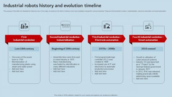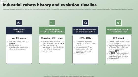 The purpose of this slide is to illustrate the historical view of four major revolutions in the field of robotics which has completely changed the various industries. These are first industrial revolution, industrialization, electronic automation and smart automation. Retrieve professionally designed Industrial Robots History And Evolution Timeline Industrial Robots Portrait Pdf to effectively convey your message and captivate your listeners. Save time by selecting pre-made slideshows that are appropriate for various topics, from business to educational purposes. These themes come in many different styles, from creative to corporate, and all of them are easily adjustable and can be edited quickly. Access them as PowerPoint templates or as Google Slides themes. You do not have to go on a hunt for the perfect presentation because Slidegeeks got you covered from everywhere. The purpose of this slide is to illustrate the historical view of four major revolutions in the field of robotics which has completely changed the various industries. These are first industrial revolution, industrialization, electronic automation and smart automation.