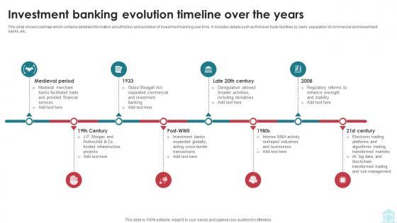 This slide shows roadmap which contains detailed information about history and evolution of investment banking over time. It includes details such as first ever trade facilities by bank, separation of commercial and investment banks, etc. Welcome to our selection of the Investment Banking Evolution Timeline Over Understanding Investment Banking Framework Fin SS V. These are designed to help you showcase your creativity and bring your sphere to life. Planning and Innovation are essential for any business that is just starting out. This collection contains the designs that you need for your everyday presentations. All of our PowerPoints are 100Percent editable, so you can customize them to suit your needs. This multi-purpose template can be used in various situations. Grab these presentation templates today. This slide shows roadmap which contains detailed information about history and evolution of investment banking over time. It includes details such as first ever trade facilities by bank, separation of commercial and investment banks, etc.