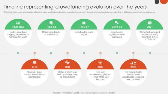 This slide shows roadmap which contains detailed information about history and evolution of crowdfunding over time. It includes details such as starting of crowdfunding, its digitalization, development of regulations, etc. If you are looking for a format to display your unique thoughts, then the professionally designed Timeline Representing Crowdfunding Evolution Crowdfunding For Nonprofits To Support Fin SS V is the one for you. You can use it as a Google Slides template or a PowerPoint template. Incorporate impressive visuals, symbols, images, and other charts. Modify or reorganize the text boxes as you desire. Experiment with shade schemes and font pairings. Alter, share or cooperate with other people on your work. Download Timeline Representing Crowdfunding Evolution Crowdfunding For Nonprofits To Support Fin SS V and find out how to give a successful presentation. Present a perfect display to your team and make your presentation unforgettable. This slide shows roadmap which contains detailed information about history and evolution of crowdfunding over time. It includes details such as starting of crowdfunding, its digitalization, development of regulations, etc.