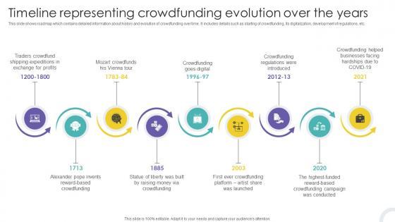 This slide shows roadmap which contains detailed information about history and evolution of crowdfunding over time. It includes details such as starting of crowdfunding, its digitalization, development of regulations, etc. This Timeline Representing Crowdfunding Evolution Real Estate Crowdfunding To Unlock Fin SS V from Slidegeeks makes it easy to present information on your topic with precision. It provides customization options, so you can make changes to the colors, design, graphics, or any other component to create a unique layout. It is also available for immediate download, so you can begin using it right away. Slidegeeks has done good research to ensure that you have everything you need to make your presentation stand out. Make a name out there for a brilliant performance. This slide shows roadmap which contains detailed information about history and evolution of crowdfunding over time. It includes details such as starting of crowdfunding, its digitalization, development of regulations, etc.