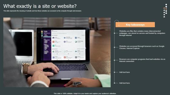 This slide represents the meaning of website and how these websites are accessed on the computer through web browsers.This is a Web Development What Exactly Is A Site Or Website Icons PDF template with various stages. Focus and dispense information on four stages using this creative set, that comes with editable features. It contains large content boxes to add your information on topics like Contains Many Interconnected, Websites Are Accessed, Internet Connection You can also showcase facts, figures, and other relevant content using this PPT layout. Grab it now.