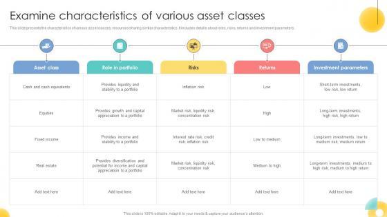 This slide presents the characteristics of various asset classes, resources sharing similar characteristics. It includes details about roles, risks, returns and investment parameters. Are you in need of a template that can accommodate all of your creative concepts This one is crafted professionally and can be altered to fit any style. Use it with Google Slides or PowerPoint. Include striking photographs, symbols, depictions, and other visuals. Fill, move around, or remove text boxes as desired. Test out color palettes and font mixtures. Edit and save your work, or work with colleagues. Download Examine Characteristics Of Various Asset Classes Strategic Investment Plan For Optimizing Risk SS V and observe how to make your presentation outstanding. Give an impeccable presentation to your group and make your presentation unforgettable. This slide presents the characteristics of various asset classes, resources sharing similar characteristics. It includes details about roles, risks, returns and investment parameters.