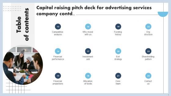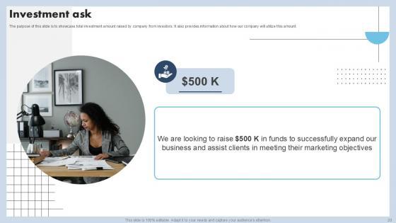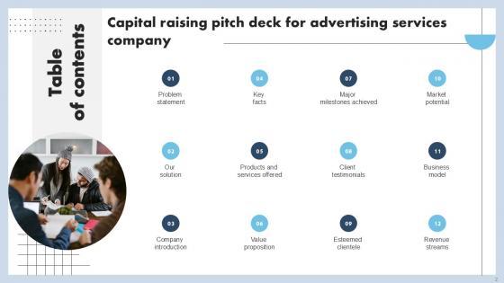 This Capital Raising Pitch Deck For Advertising Services Company Ppt Example is a primer on how to capitalize on business opportunities through planning, innovation, and market intelligence. The content-ready format of the complete deck will make your job as a decision-maker a lot easier. Use this ready-made PowerPoint Template to help you outline an extensive and legible plan to capture markets and grow your company on the right path, at an exponential pace. What is even more amazing is that this presentation is completely editable and 100 percent customizable. This thirty seven-slide complete deck helps you impress a roomful of people with your expertise in business and even presentation. Craft such a professional and appealing presentation for that amazing recall value. Download now. Our Capital Raising Pitch Deck For Advertising Services Company Ppt Example are topically designed to provide an attractive backdrop to any subject. Use them to look like a presentation pro.