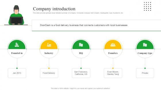 This slide provides glimpse about detailed summary of company. It includes company brief, industry, headquarter, type, founded in, etc. Are you in need of a template that can accommodate all of your creative concepts This one is crafted professionally and can be altered to fit any style. Use it with Google Slides or PowerPoint. Include striking photographs, symbols, depictions, and other visuals. Fill, move around, or remove text boxes as desired. Test out color palettes and font mixtures. Edit and save your work, or work with colleagues. Download Company Introduction Meal Delivery Service Investor Funding PPT Example and observe how to make your presentation outstanding. Give an impeccable presentation to your group and make your presentation unforgettable. This slide provides glimpse about detailed summary of company. It includes company brief, industry, headquarter, type, founded in, etc.