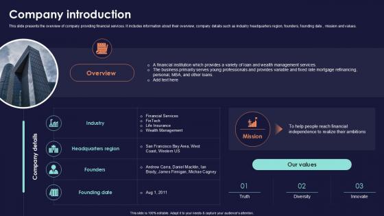 This slide presents the overview of company providing financial services. It includes information about their overview, company details such as industry headquarters region, founders, founding date , mission and values. Slidegeeks is one of the best resources for PowerPoint templates. You can download easily and regulate Company Introduction Online Financial Services Platform Ppt Example for your personal presentations from our wonderful collection. A few clicks is all it takes to discover and get the most relevant and appropriate templates. Use our Templates to add a unique zing and appeal to your presentation and meetings. All the slides are easy to edit and you can use them even for advertisement purposes. This slide presents the overview of company providing financial services. It includes information about their overview, company details such as industry headquarters region, founders, founding date , mission and values.