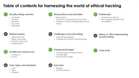 Presenting this PowerPoint presentation, titled Table Of Contents For Harnessing The World Of Ethical Hacking Ppt Example with topics curated by our researchers after extensive research. This editable presentation is available for immediate download and provides attractive features when used. Download now and captivate your audience. Presenting this Table Of Contents For Harnessing The World Of Ethical Hacking Ppt Example Our researchers have carefully researched and created these slides with all aspects taken into consideration. This is a completely customizable Table Of Contents For Harnessing The World Of Ethical Hacking Ppt Example that is available for immediate downloading. Download now and make an impact on your audience. Highlight the attractive features available with our PPTs. Our Table Of Contents For Harnessing The World Of Ethical Hacking Ppt Example are topically designed to provide an attractive backdrop to any subject. Use them to look like a presentation pro.