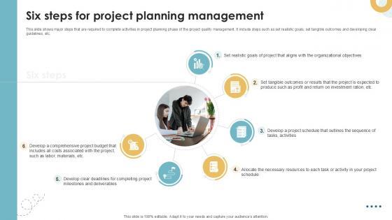 This slide shows major steps that are required to complete activities in project planning phase of the project quality management. It include steps such as set realistic goals, set tangible outcomes and developing clear guidelines, etc. Crafting an eye-catching presentation has never been more straightforward. Let your presentation shine with this tasteful yet straightforward Six Steps For Project Planning Management Executing Quality Ppt Template PM SS V template. It offers a minimalistic and classy look that is great for making a statement. The colors have been employed intelligently to add a bit of playfulness while still remaining professional. Construct the ideal Six Steps For Project Planning Management Executing Quality Ppt Template PM SS V that effortlessly grabs the attention of your audience Begin now and be certain to wow your customers This slide shows major steps that are required to complete activities in project planning phase of the project quality management. It include steps such as set realistic goals, set tangible outcomes and developing clear guidelines, etc.