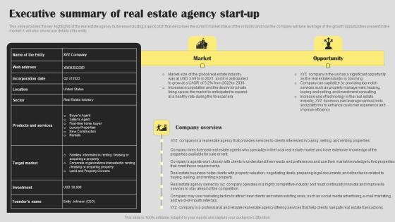 This slide provides the key highlights of the real estate agency business including a quick pitch that describes the current market status of the industry and how the company will take leverage of the growth opportunities present in the market. It will also showcase details of its entity. Whether you have daily or monthly meetings, a brilliant presentation is necessary. Executive Summary Of Real Estate Agent Business Plan Go To Market Strategy Background Pdf can be your best option for delivering a presentation. Represent everything in detail using Executive Summary Of Real Estate Agent Business Plan Go To Market Strategy Background Pdf and make yourself stand out in meetings. The template is versatile and follows a structure that will cater to your requirements. All the templates prepared by Slidegeeks are easy to download and edit. Our research experts have taken care of the corporate themes as well. So, give it a try and see the results. This slide provides the key highlights of the real estate agency business including a quick pitch that describes the current market status of the industry and how the company will take leverage of the growth opportunities present in the market. It will also showcase details of its entity.