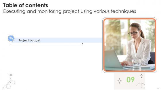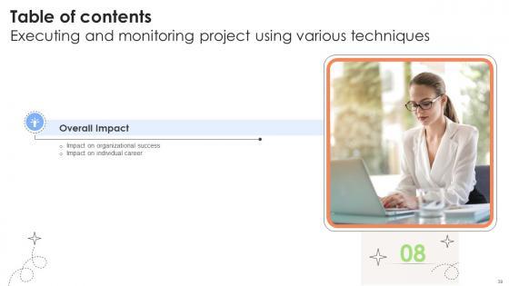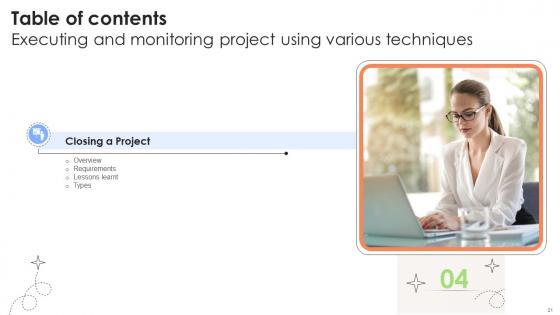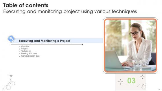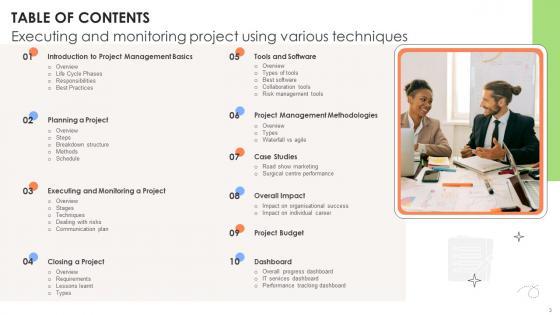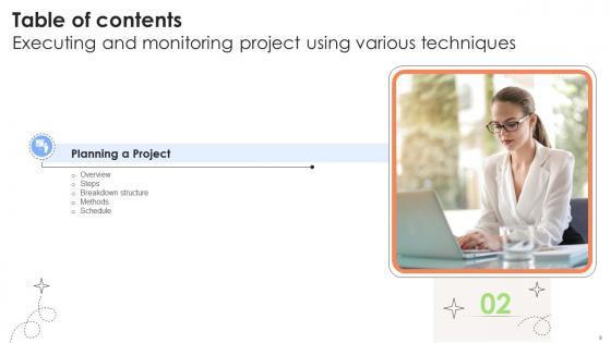 Boost your pitch with our creative Table Of Contents Executing And Monitoring Project Using Various Techniques PM SS V. Deliver an awe-inspiring pitch that will mesmerize everyone. Using these presentation templates you will surely catch everyones attention. You can browse the ppts collection on our website. We have researchers who are experts at creating the right content for the templates. So you do not have to invest time in any additional work. Just grab the template now and use them. Our Table Of Contents Executing And Monitoring Project Using Various Techniques PM SS V are topically designed to provide an attractive backdrop to any subject. Use them to look like a presentation pro.
